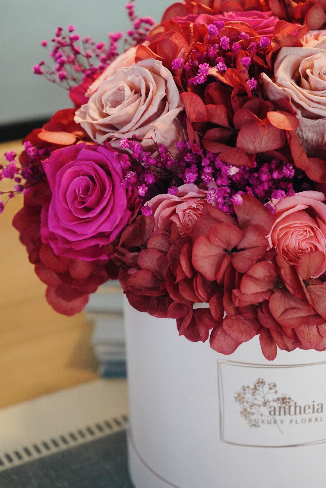 Our very first Antheia creation, crafted with preserved garden roses and hydrangeas for timeless beauty. Handcrafted to perfection and available in two sizes, this bouquet makes the ultimate gift or statement piece that lasts.